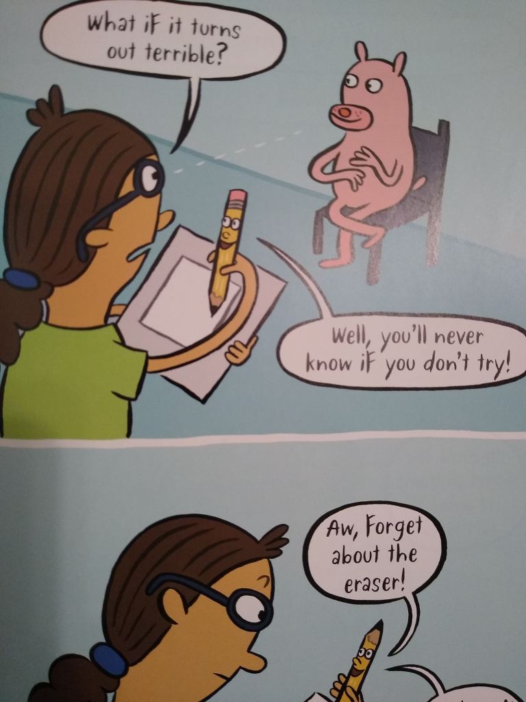 The most important theme of this graphic novel is one of growth mindset. Dweck, known for her work in the idea of mindsets (fixed and growth) suggests that if a child believes that they can develop their intelligence and consequently, “growth their brains,” it has many benefits, such as increased achievement and positive association with learning and failure (2015, para. 2). At one point, Sarah asks, “What if it turns out terrible?” to which her pencil replies, “Well, you’ll never know if you don’t try!…Id doesn’t need to be perfect.” (Varon, 2020, p. 12). This is a perfect model for young children who may have started feeling the pressure of needing to get a certain grade, or have immediate aptitude for a skill or subject. This might be due to cultural, social or family pressures. When I hear students tell me they hate school, I often ask when they started feeling that way? They always say, in 3rd grade, when they started giving us grades and we started taking the STAAR test (State assessment). While this is a frightful norm of many children, books like this can help counter those effects and encourage trying new things, creating for the sake of creating and embracing non-perfectionism.