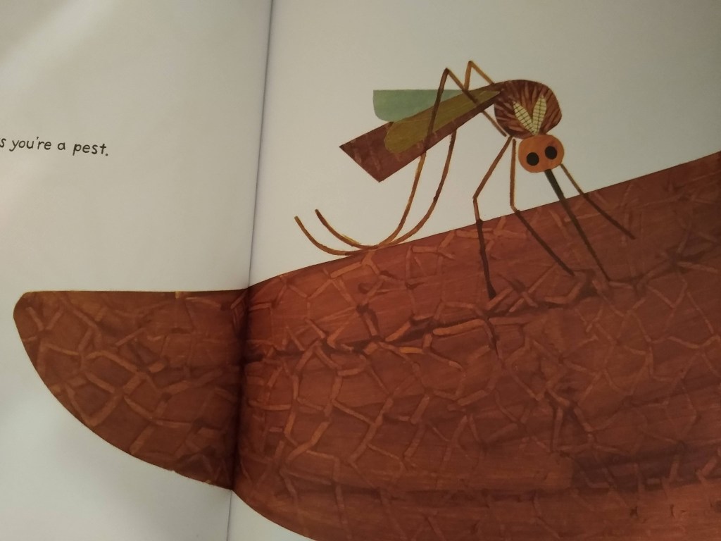 You Matter has a few laugh out loud moments. There is a scene with a mosquito that is presumably biting the appendage of some larger organism (See Image 2). In a expertly crafted use of suspense or question of who this creature or what this appendage could be, the reader turns the page to find a dinosaur. The appendage was the tail. Robinson gives life and action to the pain by adding lines as we see the bump of the bite emerge. However, the entire image is laugh out loud hilarious. First of all, the dinosaur in question is a Tyrannosaurus Rex, a ferocious, carnivore who theoretically would have had thick skin. After considering the improbability of a mosquito actually piercing the skin of a dinosaur (is that possible?), Robinson crafts the dinosaur to have the most pained look on its face. This is sure to delight readers. It is just so surprising.